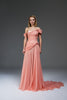 Embodies the warmth and radiance of the Spectrum’s sunset tones. Crafted with a nude crepe bust that melts into a fully draped bodice of pleated sequin tulle, the gown flows effortlessly into a chiffon skirt that trails with graceful lightness. The off-shoulder silhouette and organic draping create movement and depth, evoking the calm energy of light fading into dusk.