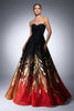 A bold couture statement crafted in luxurious organza, this Ornelys design features a dramatic red-to-black gradient organza skirt, adorned with gold leaf–inspired printed motifs that catch the light with every movement, creating a powerful visual rhythm.