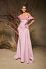 The draped bodice flows asymmetrically across the waist, sculpting the silhouette with fluid elegance. From the hips, the gown extends into a long, fluid skirt that moves effortlessly with each step, creating a graceful and feminine finish.