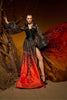 A dramatic couture gown inspired by the rebirth of fire and light. Crafted from hand-painted satin and sheer organza, it blends deep ember tones with luminous gold accents. The gown features voluminous bishop sleeves, a sculpted corset waist, and a flowing skirt with a high slit that reveals both strength and sensuality.