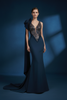 Faites sensation lors de toute occasion spéciale avec cette robe de soirée navy sophistiquée. La coupe sirène ajustée est taillée dans un crêpe lisse pour un rendu sculptant, tandis que l'encolure plongeante en V scintille de sequins cousus à la main dans un mélange tonal bronze-doré. Un nœud oversize dramatique à l'épaule se transforme en une longue sash fluide, apportant mouvement et allure couture.