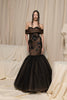 A sculpted off-shoulder mermaid gown in sheer black tulle and silk organza. Striped layers reveal and conceal the body beneath, while hand-appliquéd black florals climb across the torso. The skirt erupts into a dramatic, layered tulle fishtail that moves like a shadow.