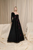 A dramatic one-shoulder black gown crafted in layered tulle with a full A-line skirt. The bodice features a sculpted off-shoulder neckline with ruched long sleeves and a statement tulle bloom on the shoulder. Deep magenta hand-embroidered florals and black beading cascade from the waist down the skirt, adding texture and movement to the dark base.