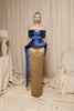 A sculptural two-tone gown combining deep sapphire blue and molten gold. The off-shoulder pleated bodice wraps the upper body with a cinched belt and exaggerated peplum panels that cascade into long side drapes. The slim column skirt in textured gold creates a striking contrast and elongates the silhouette.