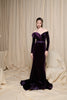 A long-sleeved off-shoulder gown in deep amethyst velvet. The fitted silhouette skims the body before flaring into a subtle train. A sculptural pleated accent blooms from one side of the neckline, echoing a flower in midnight velvet, and a matching belt cinches the waist.