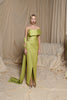 A sleek black column gown cut from softly textured fabric, designed to sculpt the body. The strapless bodice rises into dramatic petal-like folds lined in vivid fuchsia, framing the neckline like a blooming flower. The back features a clean line with a discreet slit for movement. Elegant and architectural, this dress turns minimalism into impact.
