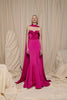 A fuchsia crepe gown with a sculpted strapless bodice and built-in belt, flowing into a sleek floor-length skirt. Long cape-like panels cascade from the shoulders, creating movement and drama with every step. The design combines a precise, body-hugging cut with bold, fluid draping for a striking silhouette.