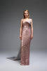 Embodies the dialogue between warmth and light — where rose hues meet silver tones in perfect balance. Crafted from blush sequin-embroidered tulle, it features a structured neckline accentuated with a Silver Mesh overlay that adds a futuristic glimmer. The sleek silhouette flows into a soft train, creating a harmonious play of reflection and contrast — a signature of the Spectrum’s radiant aesthetic.