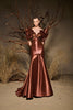 Faites tourner les têtes avec cette robe de soirée d'un cuivre saisissant. Confectionnée dans un tissu au fini satiné lumineux, la robe sculpte la silhouette avant de s'épanouir en une jupe dramatique longue jusqu'au sol. Le corsage structuré est rehaussé de plis transparents et d'imposantes applications florales sur les épaules, pour un look à la fois audacieux et féminin.