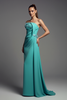 This strapless evening gown is crafted in a rich turquoise crepe with soft draping across the bodice and waist. Sequined floral appliqués at the neckline and hip add sparkle and dimension. The fitted bodice flows into a floor-length skirt with a subtle train at the back.