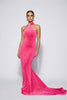 Crafted in luminous pink velvet, this Ornelys design gown embodies modern sensuality and sculptural elegance. The halter neckline frames the shoulders beautifully, while the open back and figure-hugging silhouette highlight the body’s natural curves. Flowing into a sweeping train, the dress moves with graceful fluidity,  perfect for red-carpet events, galas, or formal evening occasions. The rich velvet texture catches the light, giving the gown a sophisticated yet daring allure.