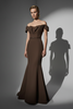 A sculpted off-shoulder evening gown in deep chocolate brown, designed with an architectural bodice, subtle beaded detailing, and a refined mermaid silhouette. The fitted waist and clean lines create a sharp, modern profile, making this Ornelys designer gown for women seeking a contemporary brown formal dress with strong, structured presence.