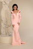 A sculptural gown in delicate blush crepe, designed with a statuesque mermaid silhouette. The deep plunging neckline is framed by bold, sculpted shoulders and long fitted sleeves, fully adorned in shimmering sequins. This interplay of smooth crepe and radiant embellishment creates a striking harmony of structure and sparkle. Sleek lines elongate the form, while the subtle train completes the look with timeless elegance.